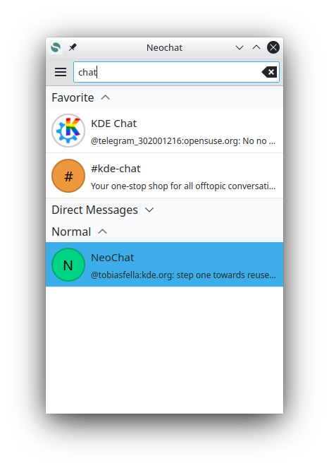 Neochat is a client for Matrix, the decentralized communication protocol for instant messaging. It is a fork of Spectral, using KDE frameworks, most notably Kirigami, KConfig and KI18n.